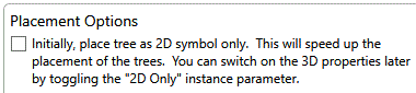 If Existing Trees are placed in the project with the 2D Symbol Only toggle on, users can subsequetly switch on the 3D View option by togling the "2D Only" instance parameter.