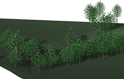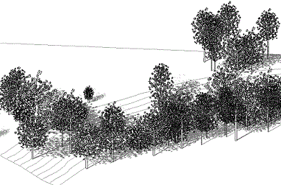 Existing Trees are placed in 3D View hosted to the topography and are sized automatically by dimensions parameters imported from the Existing Tree Survey.