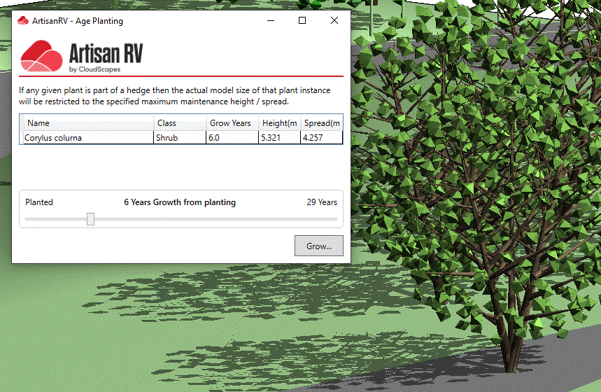 Selected planting is displayed with columns for Grow Years, Height and Spread. Note that if any given plant is part of a hedge then the actual model size of that plant instance will be restricted to the specified maximum maintenance height/spread.