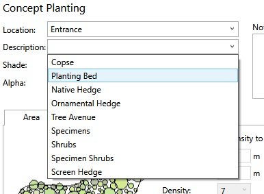 Define a Description (if required) by selecting from the pop down menu or defining a new Description by typing in the edit box. The Description pop down list is populated automatically whenever Concept Planting objects are placed in a model.