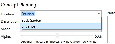Define a Location (if required) by selecting from the pop down menu or defining a new Location by typing in the edit box. The Location pop down list is populated automatically whenever Concept Planting objects are placed in a model.