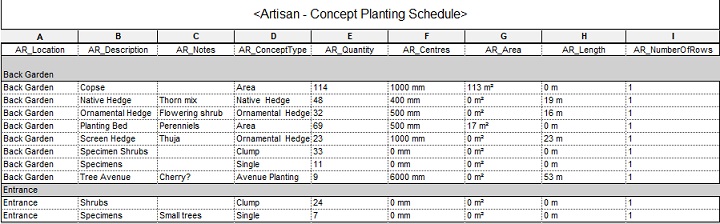 From the Schedules/Quantities area in the Project Browser, select Artisan - Concept Planting Schedule.