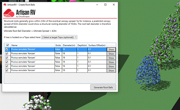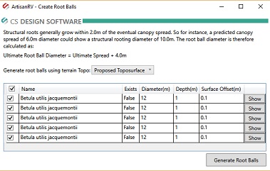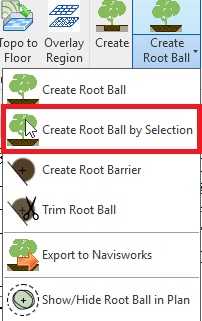Root Balls can be created for all proposed trees using the Create Root Ball command, where it is also possible to refine the selection set by toggling individual tree instances. To create Root Balls for particular specimens or groups of trees, use the Create Root balls by Selection tool.