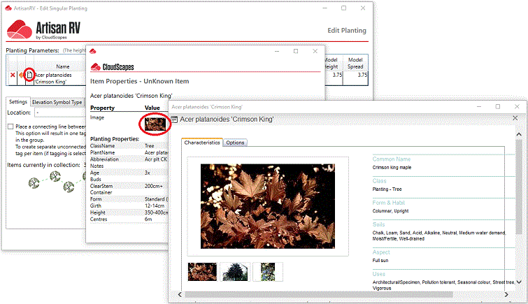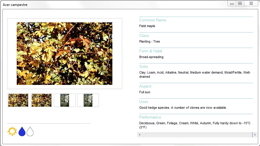 Pick on the plant photo icon to display the associated plant characteristics and performance information.