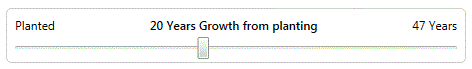 Planting is grown using the Age Planting routines using parametric modelling to size a plant, hedge or planting area by the ultimate height/spread and years to maturity (years to achieve ultimate height/spread). Picking Edit Planting displayes a slider bar with the current 'model age' indicated and a definable range between the age at the time of planting through to the maximum number of years to maturity for any plants in the current model.