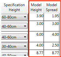 These values are calculated based on the specification parameters and the ultimate height/spread values at the defined 'growth' of the selected planting. Ultimate Height/Spread values can be edited from the By Planting By Year option from Age Planting which will result in a recalcualtion of the Model Height/Spread values displayed in the Edit Planting dialog.