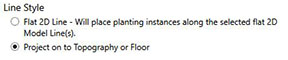 Users are able to place planting that is automatically projected on to Topography or Floor, if these are available in the model. An option exists to place linear planting along the selected Model Line, which does not attempt to project on to a Topo of Floor if these have yet to be created.