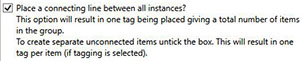 Connected plants may be linked by a dashed line to signify that they are they are joined. If a connecting line is placed between all instances and tagging has been selected, a single tag is placed providing a total number of items in the connected group. If the option has not been selected to 'Place a connecting line between all instances' and tagging has been selected, individual tags are placed for each items in the connected group.
