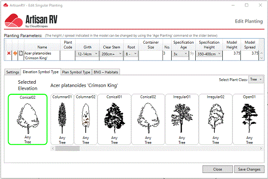 Note that the Elevation Symbol Type selected, determines the associated planting model form (Voxels and Primitive) that are applied to that plant type.