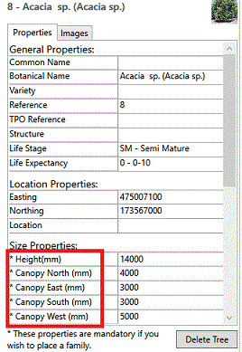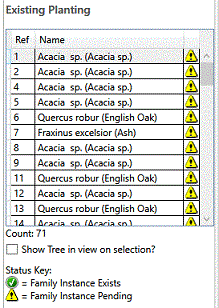 Individually select Existing Tree instances from the list box and confirm that data is correct and complete prior to moving to Placement Options. Note that some properties are marked as 'mandatory' prior to picking Place Selected Tree(s).