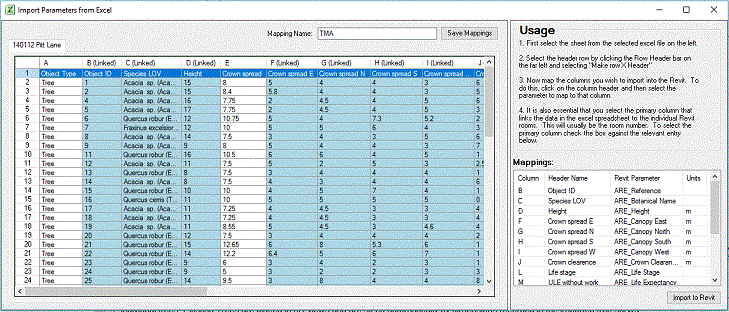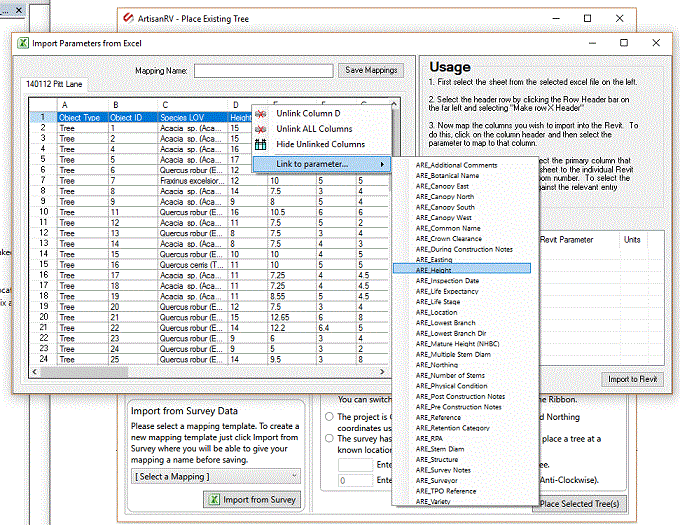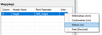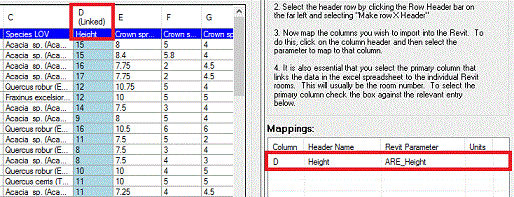Map columns to import to Revit by selecting the column header and then picking the required parameter to map to that column.