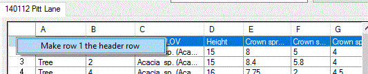 Picking Import from Survey Data with no Mapping File selected opens a dialog to define parameter mapping for the imported source data. Select the required sheet and define the Header Row by selecting the Row Header bar and picking "Make row X Header".