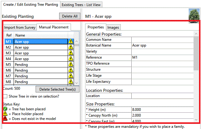 In the Properties area, enter details as required from source survey information… if more than one existing tree placeholder has been selected, values added in the Properties area will be applied to all selections.