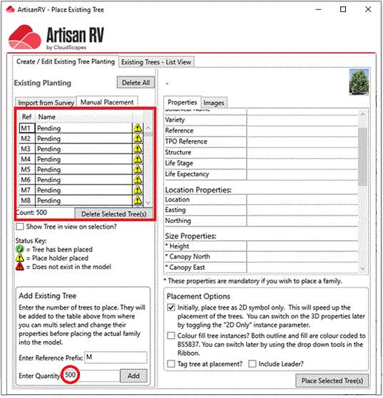 In the example below, the Reference Prefix 'M' has been used and 500 Existing Tree Placeholders have been added.
