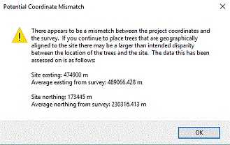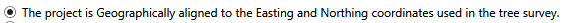 Landscape projects should be geographically located so that Existing Trees can be aligned automatically using Easting and Northing coordinates used in the tree survey. If the project has been geographicaly aligned to the Easting and Northing coordinates in the Existing Tree Survey, select the associated radio button.