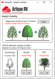 To Graphics Visibilty tool enables users to switch between different visual representations of planting including Symbology, Primitives, Voxels and Realistic Photo-real Content (RPC).