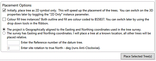 Placement Options control how Existing Tree Survey data is aligned to the project coordinates and orientation, whether placement is initially as 2D only and whether the plan view is diplayed with colour fill or outline colour.