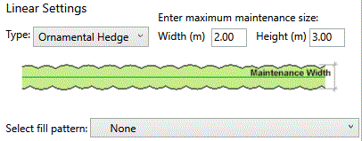 Note that there is an option to define/select a pattern fill to an Ornamental or Native Hedge and the width of the hedge in Plan View is defined by the maximum Maintenance Width specified.