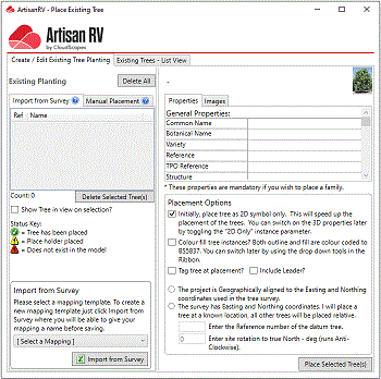 Existing Tree Survey data is usually collected using hand held devices on site. This utility enables imported Existing Tree Survey fields to be associated to parameters in the Existing Tree Families using a Mapping tool prior to placing Existing Trees in the current model.