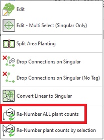 A plant count is held against each plant type as a new instance is placed. The Plant Count is used in the Compact Tag. The Re-Number options ensure that the Plant Count records remain sequentlial if previous instances have been deleted or if multiple linear planting segments have been broken.