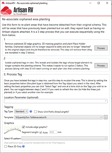 The utility is a 3-step process that needs to be run sequentially. The first step is to remove orphaned graphics and hidden placeholders from the model; the orphaned tags are then isolated on a view by view basis; the final step is to re-plant selected areas.