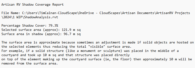 Export: Results of the Shadow Coverage Analysis can be output by picking Export. Results are opened automatically in a text editor (as below) and can be saved as required.
