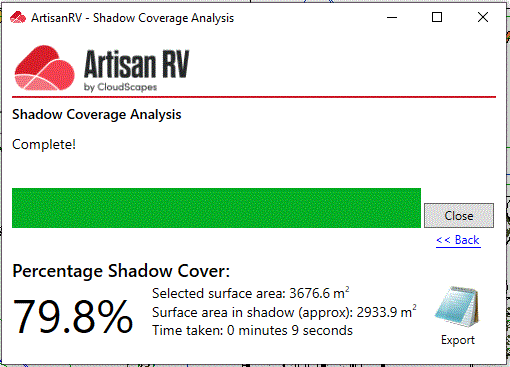 The Percentage Shadow Cover is displayed along with details of the total calculated target area and the area in shadow. For information, the time taken for the Shadow Coverage Analysis to complete is also displayed.