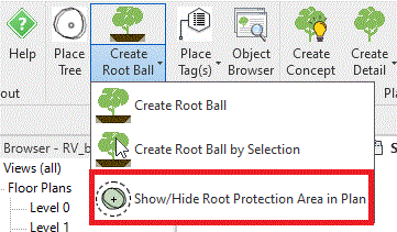 Show/Hide Root Protection Area in Plan is available from the Existing Create Root Ball menu.