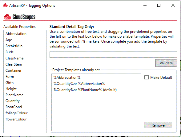 Drag from the list of Available Properties to the edit box where they will be surrounded with % markers. Add free text entries as required and pick Validate to test new template.