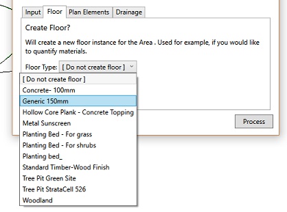 Users are able to place a Floor at the same time as creating an Area Pad by selecting from the Floor Type pop-down menu before picking Process on the Create Area Pad dialog.