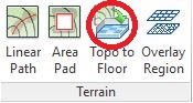 The Topo to Floor tool enables Toposurfaces and Split Topos to be converted to Revit Floors. Topo to Floor is typically used to convert an area of Topo to allow subsequent material take-off of soil build-up.