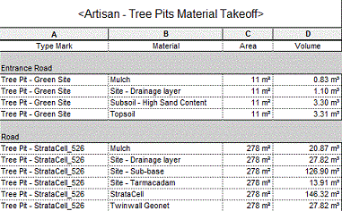 From the Schedules/Quantities area in the Project Browser, select Artisan - Tree Pits Material Takeoff.