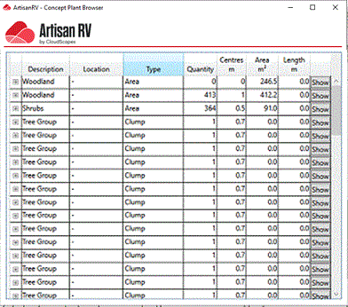 View all Concept Planting Objects provides a centralised Concept Plant Browser where users can quickly view and modify Description, Location and Centres parameters.