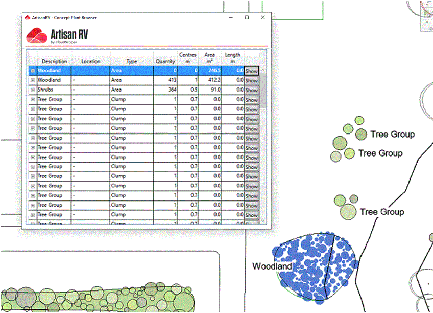 Pick Show to display selected Concept Planting in plan view.