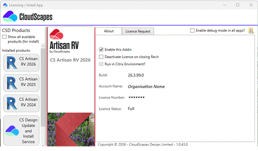 Select Licence, Settings and Install from the CSD Buddy App to display the Licensing/Install App dialog.