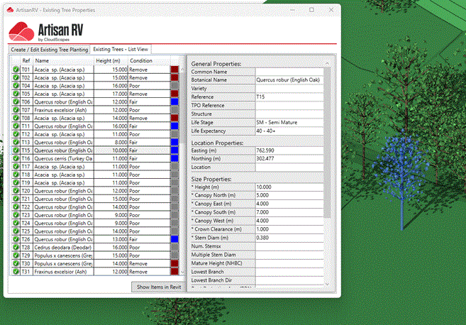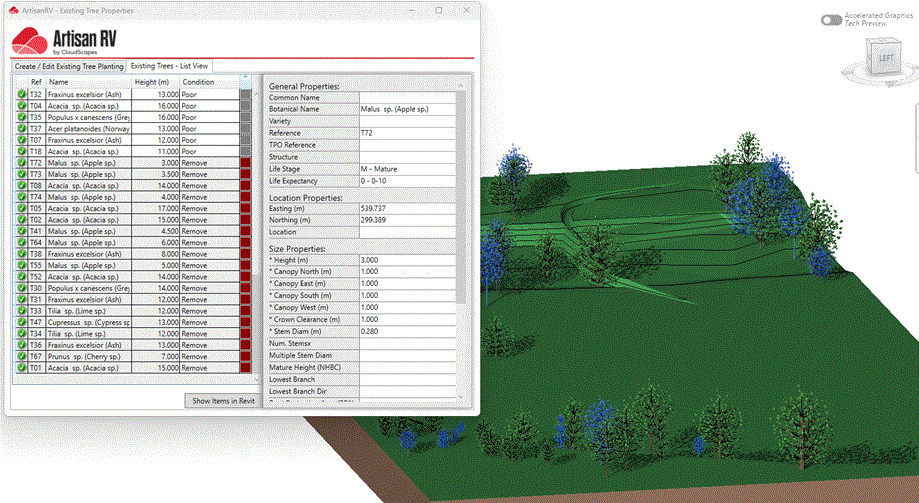 Select multiple instances by manual selection or sorting the list to display Existing Trees by Name or Condition and pick Show Items in Revit to view in the model. This provides an easy mechanism for identifying instances in context, for example, Existing Trees to be removed...
