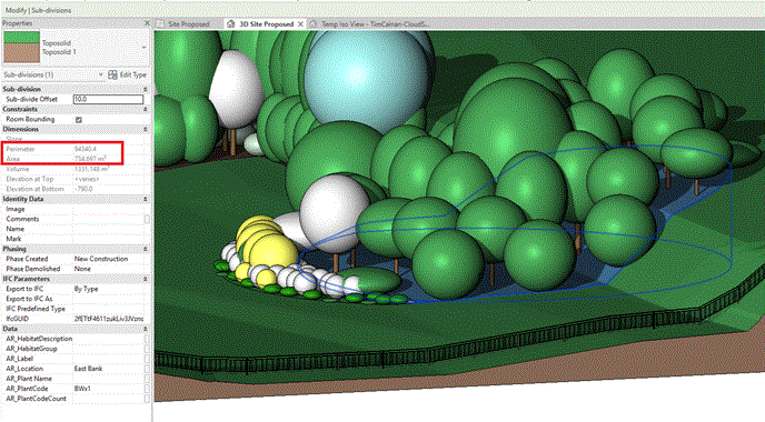 The boundaries of planted areas are displayed with an illustrative vegetation graphic. Individual planting numbers are calculated based on the defined centres value and the selected area (real-world area projected onto topography) and a Tag is placed in the view.